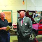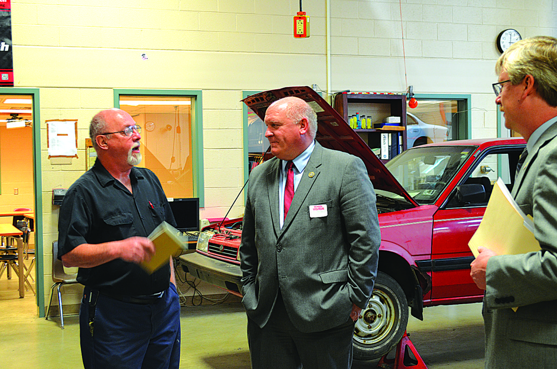 SARAH PAEZ/THE EXPRESS Auto collision repair and auto technology instructor Harry Wolfe talks with U.S. Rep. Glenn “GT” Thompson as CTC Director Ken Kryder looks on.