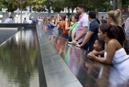 AP Photo/Mark Lennihan Visitors look at the waterfalls at the World Trade Center Memorial in New York. As they have done 17 times before, a crowd of victims' relatives is expected at the site on Wednesday, Sept. 11, 2019 to observe the anniversary the deadliest terror attack on American soil.