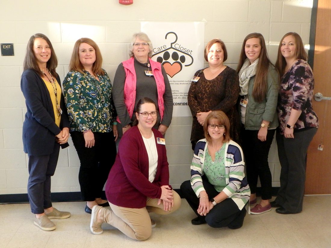 PHOTO PROVIDED These are some of the Jersey Shore Middle School teachers who are participating in the operation of a Care Closet at the school to provide students with things they need, from clothing to personal hygiene and specialty items. From left are, at top, Mrs. Rodabauch, Mrs. Charnego, Mrs. Morlock, Mrs. Stamm, Ms. Richards, and Mrs. Enders; at bottom, Mrs. Silvis and Mrs. Fedele.
