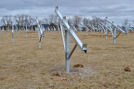 CHRIS MORELLI/THE EXPRESS Centre County commissioner Steve Dershem examines one of the post-driven ground mount racking system for the solar array, which is currently under construction at the Centre County Correctional Facility.