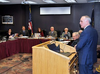 - CHRIS MORELLI/THE EXPRESS Centre County District Attorney Bernie Cantorna addresses Bellefonte Borough Council at Monday night’s meeting. Cantorna presented the borough with a $15,000 check toward police body cameras.