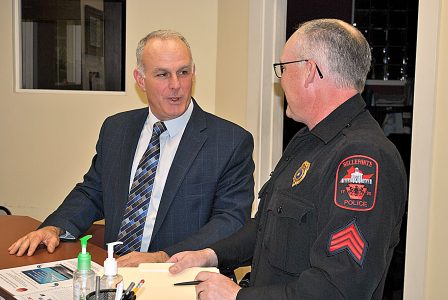 CHRIS MORELLI/THE EXPRESS Centre County District Attorney Bernie Cantorna talks with Bellefonte Police Department Sgt. Jason Brower following the Bellefonte Borough Council meeting on Monday night. Brower is responsible for training associated with police body cameras.