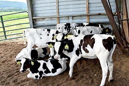 - LAURA JAMESON/THE EXPRESS A group of eight-week-old cows socialize after spending their first weeks of life in their own individual hutches to prevent the possible spread of disease.