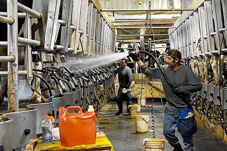 - LAURA JAMESON/THE EXPRESS Two farmhands sanitize the cows udders before beginning the milking process.