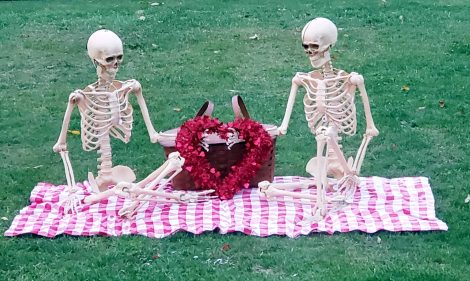Every day, without fail, the skeletons are doing something different. For example, one day, she had them ready for a rain storm, complete with an umbrella and poncho. Another day, they were washing the car. For Bellefonte’s Homecoming, she dressed the skeletons in Red Raider football jerseys. Most recently, she positioned the skeletons for a picnic lunch.