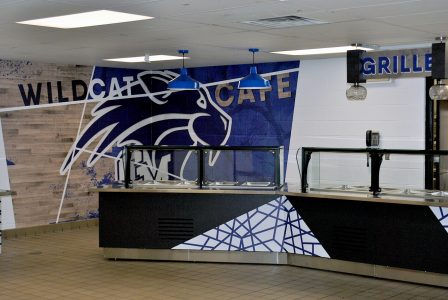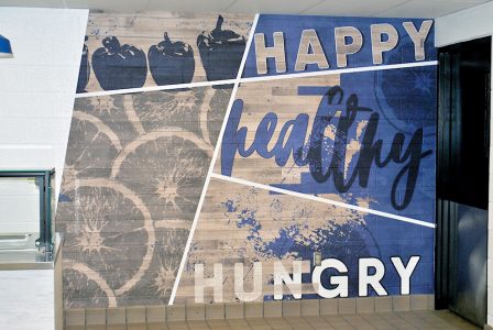 On the walls, the decals and designs feature different types of student activities. Academics, art and sports are well represented on the walls. A large “CM” decal somewhat covers the cafeteria’s large window, but still allows for plenty of sunlight to come in.