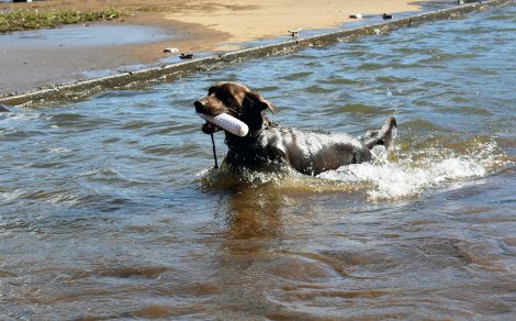 LAURA JAMESON/THE EXPRESS Decoy happily brings the toy he retrieved back to his owner at the Woodward Township Boat Launch.