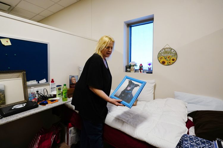 Karla Finocchio, 55, holds up a picture of her dog in her modest housing at Ozanam Manor temporary housing for people 50 and up, Friday, Feb. 4, in Phoenix.