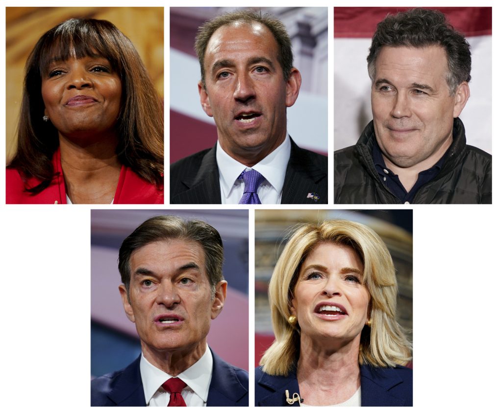 AP Photo/Matt Rourke In this photo combination of images taken in 2022, are Republican candidates for U.S. Senate, from top left, Kathy Barnette, Jeff Bartos and Dave McCormick, and Mehmet Oz, bottom left, and Carla Sands. The five met in Harrisburg, Pa., for a debate on Monday, April 25.