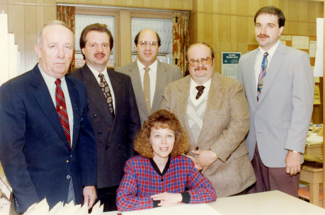 PHOTO PROVIDED Vickie Buckle, seated, is pictured with other members of The Express’s advertising staff in the late 1980s/early 1990s. They are, from left, Don Ryan, Terry Wyant, Pat Leone, Keith DeVal and Rick Noll.