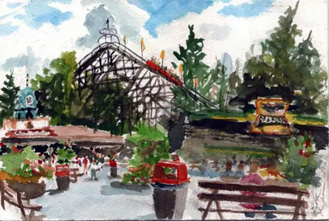 Pictured is a watercolor image of Knoebels Amusement Resort in Elysburg painted en plein air by Beth DeJesus on Aug. 20, 2021. DeJesus will bring her talent to LH JAMS Music and Art Festival on Saturday, Aug. 13. PHOTO BY BETH DEJESUS