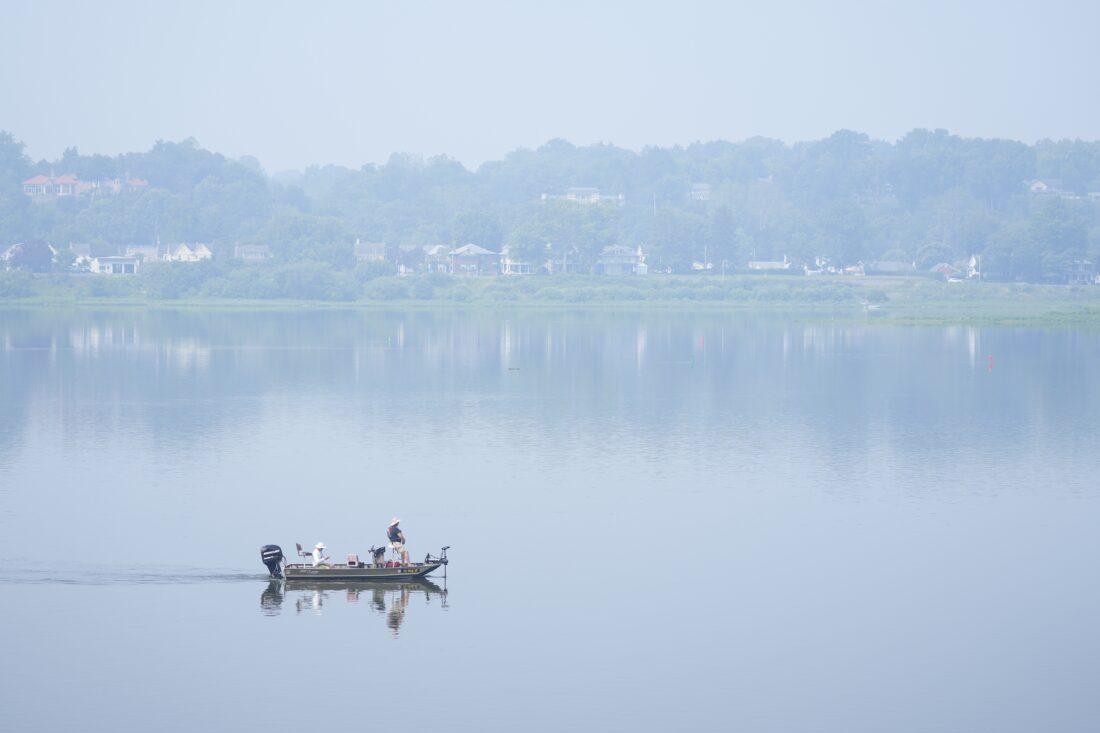 AP Photo/Matt Rourke, File People fish on the Susquehanna River amidst haze from Canadian wildfires, June 29, in Harrisburg, Pa.