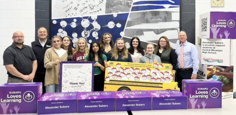 BREANNA HANLEY/THE EXPRESS Pictured, from left, Dave Peters, CMHS Athletic Director and Assistant Principal; Dave Kelly, General Manager of Blaise Alexander Subaru of Montoursville; students Addison Kelley, Maia Crowell, Juliana Onuskanich, Alex Acuna, Kylie Keener, Maille Fowler, Burke Herrick, Ryleigh Hockenberry; Alisha Rider, Finance Admin for Blaise Alexander Subaru of Montoursville; and CMHS Principal Nick Verrelli.