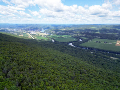 PHOTO PROVIDED COURTESY OF BUDDY NASH A drone photo taken near the wreckage shows the the steep, dense forest through which Yatsko had to descend to reach Route 220. Lock Haven is seen sprawled at upper left.