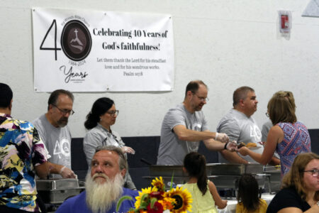PHOTO PROVIDED A sign denoting the 40 years of Big Woods Bible Church hangs over parishioners as they enjoy a celebratory meal.