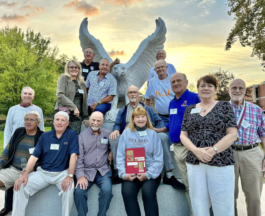 PHOTO PROVIDED Lock Haven State College Class of 1973 alumni celebrate their 50th class reunion at Lock Haven’s Grand Bald Eagle Statue during Haven Homecoming 2023.