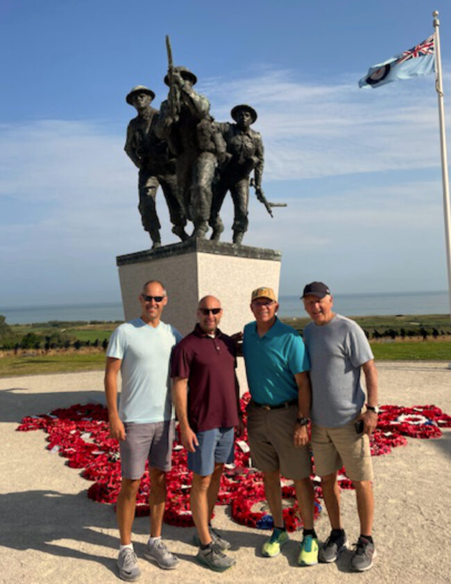 Pictured, from left, are Matt Rendos, Mike Rendos, George Elliot and Michael Rendos at the British Memorial at Gold Beach. PHOTO PROVIDED