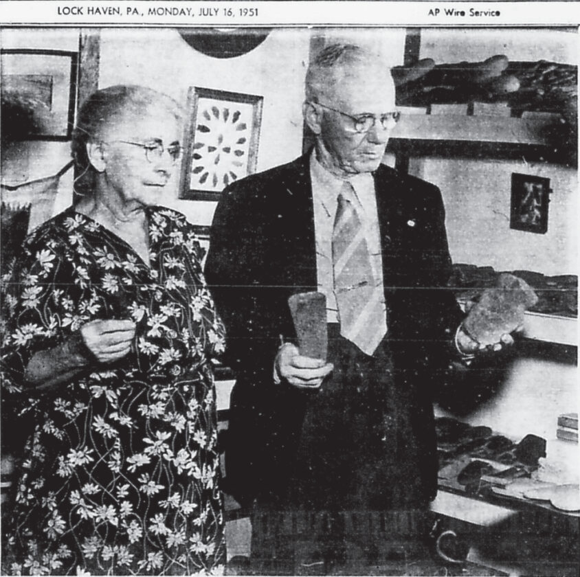 EXPRESS ARCHIVES Mr. and Mrs. C.C. Ricker, of McElhattan, who are planning to move to Sunbury in September to make their home near their son and daughter-in-law, are shown here examining several items of the extensive collection of Indian relics and artifacts which Mr. Ricker has decided to give to the Ross Library of this city. The collection also includes a wide variety of other historical curiosities, collected by Mr. Ricker, during his long residence at McElhattan, in the home built by his father. Many of his Indian relics were found in the immediate vicinity of McElhattan.