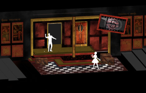 In Cross’s set design, the projection screen or “movie screen” acts as both a scenic and interactive element. It guides the audience through key moments, displaying callouts and cues that encourage participation with their props.