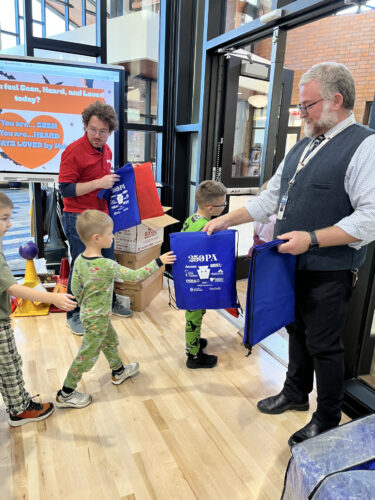 Superintendent Frank Redmon and a volunteer with America250PA are pictured while passing out goodie bags to Liberty-Curtin students after the assembly.