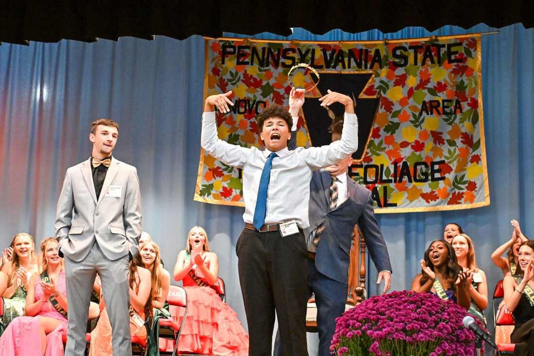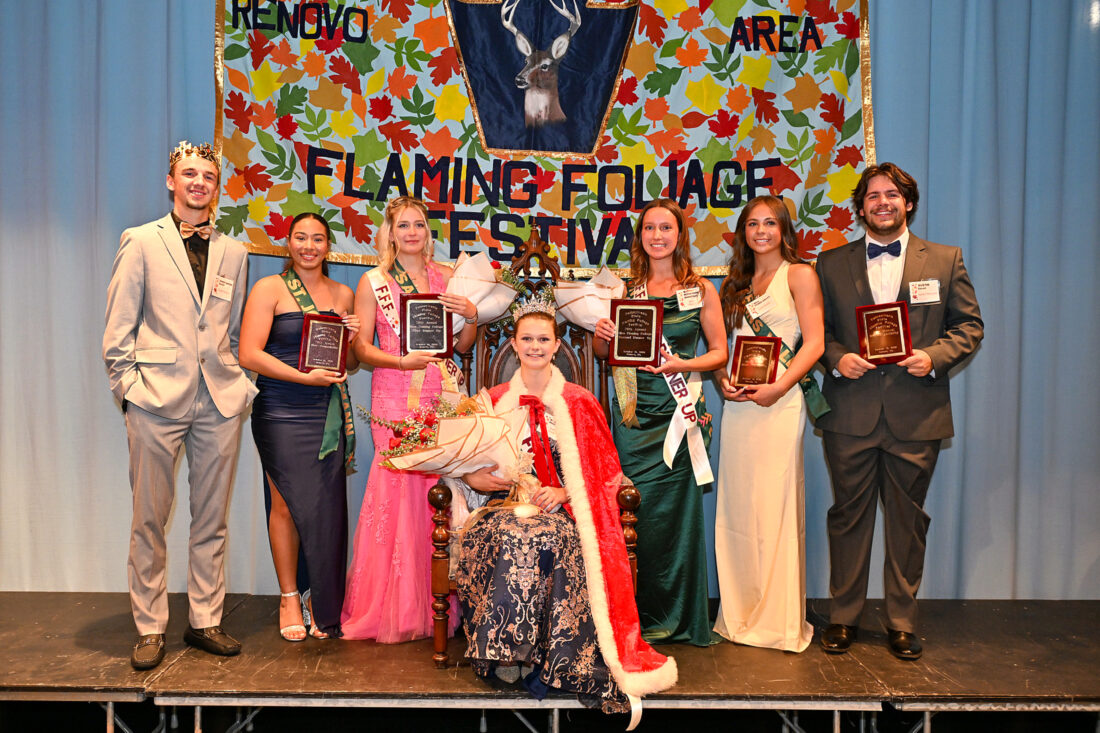TIM WEIGHT/FOR THE EXPRESS Miss Hughesville, Madalyn Gordner, center, is pictured after being crowned the 2025 Flaming Foliage Queen. Also pictured, in no particular order, are First Runner Up Miss St. Mary, Olivia Lenze; Second Runner Up, Miss North-Penn-Mansfield, Elena Hazelton; Miss Congeniality, Miss St. John Neuman, Breanna Nixon; Miss Photogenic, Miss Penns Valley, Callie Riddle; Mr. Congeniality, Mr. Austin, Cayden Trumpie; and escort dance-off winner Mr. Jersey Shore, Tucker Janna.