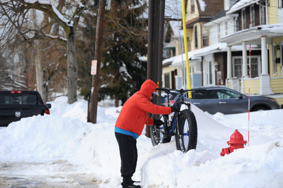 Photo by John Normile/Getty Images A pedestrian lifts his bike over snow piles after a storm in Buffalo, New York. Buffalo is among the older industrial cities where residential properties have drawn interest from corporate investors.