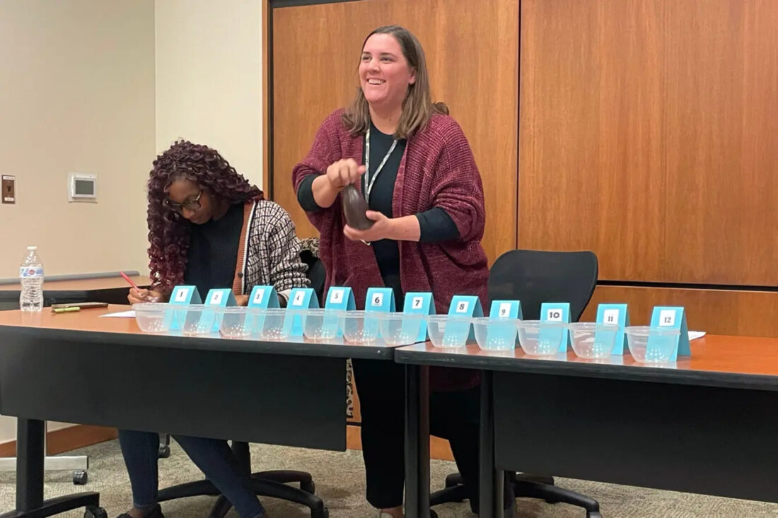 Carter Walker/Votebeat VIA SPOTLIGHTPA Christa Miller, Lancaster County’s election director, shakes a bottle filled with red, numbered marbles to determine the winner of tied races.