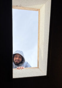HUNTER SMITH/THE EXPRESS A roofer for Starway Roof Systems is seen through the skylight of the Sharpe home in Bellefonte as he installs a portion of the couple’s new roof on Monday.