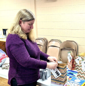 - PHOTO PROVIDED Club President Lisa Schropp ties a tag on one of the gift bags.