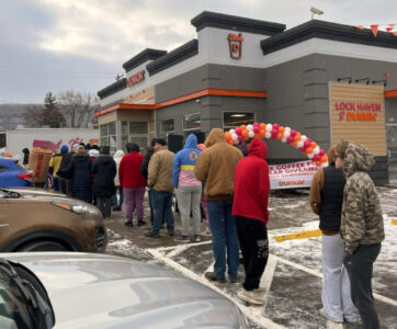 MEGAN MUTHLER/THE EXPRESS A line of eager customers wait to be one of the first 100 customers to receive free Dunkin Donuts for a year during the business’s official grand reopening.