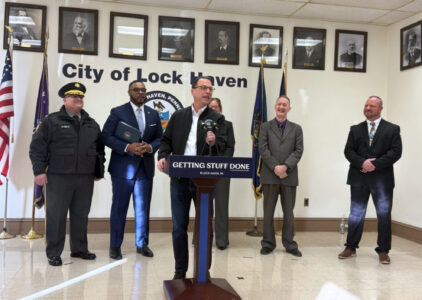 LAURA JAMESON/THE EXPRESS PA Governor Josh Shapiro, at the podium, is joined by, from left, PA State Police Colonel Christopher Paris, Lt. Gov. Austin Davis, Clinton County Commissioner Angela Harding, Lock Haven Mayor Joel Long, and LHPD Chief Matthew Rickard.
