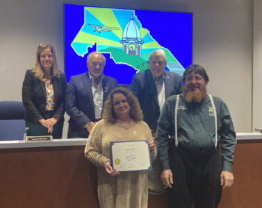 LAURA JAMESON/THE EXPRESS Lock Haven City Council approved a proclamation to honor out-going Council member Steve Stevenson. The proclamation also included a “key to the city” and many thank yous for Stevenson’s nearly 20 years on council. Pictured, from left, are council members Heather Alexander, Tami Brannan, Barbara Masorti, Stevenson, Rick Conklin and Jeff Brinker.