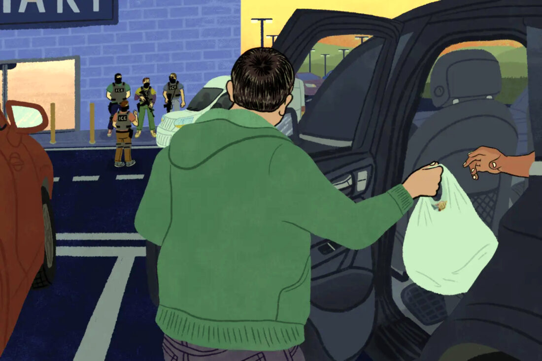 Daniel Fishel / For Spotlight PA An illustration made for Spotlight PA shows a person in a green sweatshirt handing a bag of groceries to someone in a car as ICE agents stand in front of a grocery store.