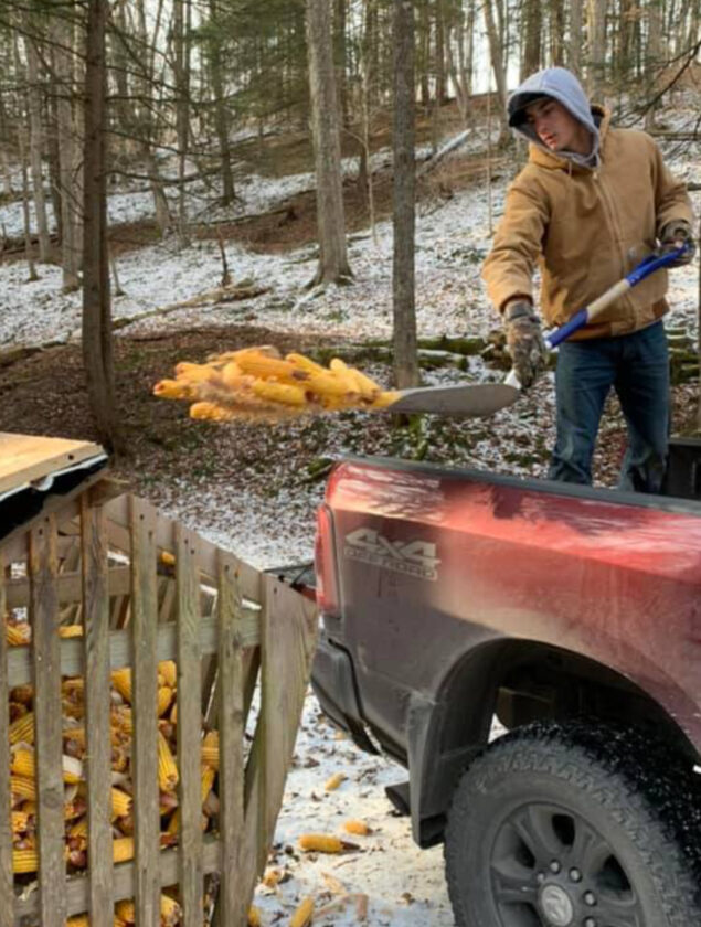 PHOTO PROVIDED A member of the Cross Fork Sportsman’s Club tosses ears of corn into a feeder during the club’s 2022 distribution. The club, among others, will no longer be doing this distribution as it follows PA Game Commission guidelines.
