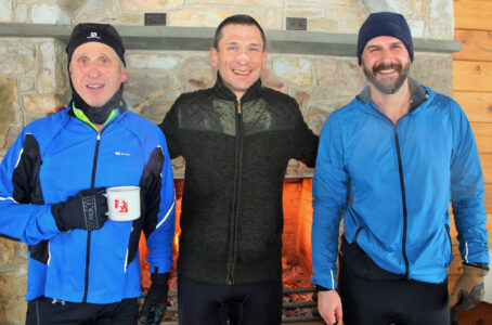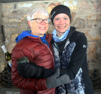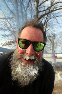 She said, “I’ve registered for the Frozen Snot since 2018, but didn’t race twice due to injuries, so this is my seventh time to compete, and it was the most difficult. It was cold, but still really nice to get into the iconic climbs. A high point for me was getting to the Bacon Station (one of the race aide stations infamous for serving up bacon to bolster the participants for the remainder of the race) and being heckled by (volunteer) Mike Haffley!”