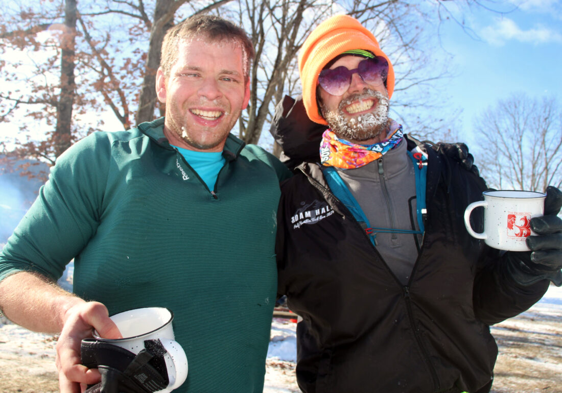 PHOTO BY JULIE BRENNAN Frozen Snot Race Director Luke Ebeling, right, congratulates Koltin Hammer of Erie, Pa., who finished first in the 13.5-mile long course at Saturday’s Frozen Snot trail race. Male and female top finishers in both the long and short courses received a commemorative stone mug and a specially-labeled bottle of wine from Oregon Hill Winery.