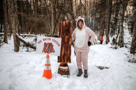 - PHOTO BY EMILY SHAFFER Frozen Snot volunteers cook and serve up bacon and other snacks to hungry runners at the on-course Bacon Aid Station — a favorite refueling stop for participants along the way.