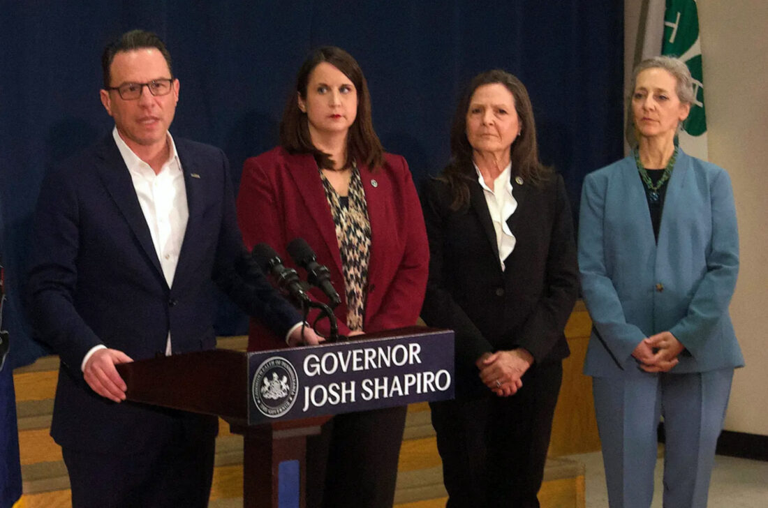 Gabriela Martinez for Spotlight PA Gov. Josh Shapiro speaks at a press conference at Berks County Agricultural Center in Bern Township on Feb. 26. From left, he is with Department of Environmental Protection Deputy Secretary Jill Whitcomb; Labor & Industry Secretary Nancy Walker, and Department of Health Secretary Dr. Debra Bogen.