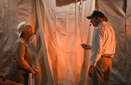 KEVIN RAUCH/FOR THE EXPRESS Sharon Redmond, who wrote and co-directed A Murder at Shingle Branch Camp 77 along with her husband Dr. Frank Redmond, emphatically tries to get her point across to fellow actor Bob Shank, in the Greater Renovo Area Heritage Park play.