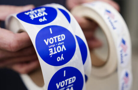 Matt Smith/For Spotlight PA A poll worker holds voting stickers on Nov. 7, 2023.