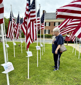 PHOTO PROVIDED Margaret Bouder gazes at the plaque honoring her husband, Gerald “Butch” Bouder, during the 2025 Flags of Honor display in Triangle Park. The Bouders also sponsored flags for William H. Garrett and Edward M. Hill.