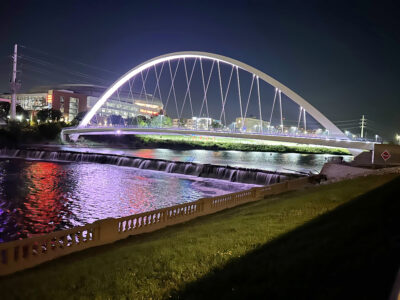 The northern edge of the trail features the Iowa Women of Achievement Bridge. This pedestrian-only bridge is a modern addition which celebrates Iowa women’s contribution to the local and national community. This is a feature for night walks as the colorful bridge lights reflect off the Des Moines River.
