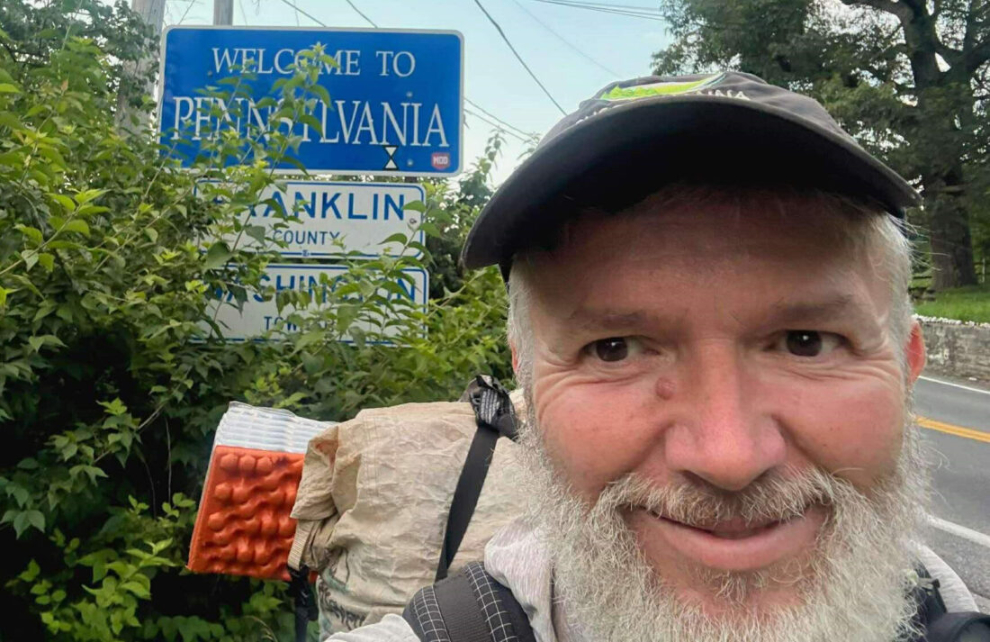 PHOTO PROVIDED John Mosso crosses into Pennsylvania on his Appalachian Trail thru-hike in this photo by the Susquehanna Greenway Partnership.