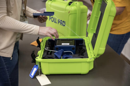 Photo by Montinique Monroe for Votebeat via Penn Capital Star Election workers in Bryan, Texas, unpack electronic pollbooks for the Nov. 5, 2024, election. In Pennsylvania this November, more than half of the counties will check in voters at the polls using e-pollbooks.