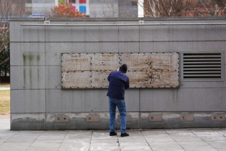 Empty bolt holes and shadows are all that remains on the brick walls where explanatory panels were displayed at the President’s House Site, where George and Martha Washington lived with the people they owned as property when Philadelphia was the nation’s capital. One woman cried silently at their absence. Someone left a bouquet of flowers. A hand-lettered sign said “Slavery was real.”
