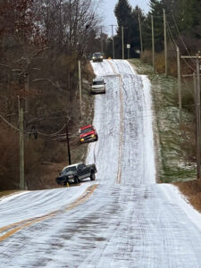 Treacherous conditions and untreated roads did not mix well for those traveling state routes in the Loganton area on Tuesday morning. In this photo vehicles can be seen in ditches and on the side of the road after attempting to maneuver the big hill near Logan Mills on state Route 880/West Valley Road. Other parts of The Express’s coverage area also saw crashes — including one which shut down a portion of Interstate 80 into Centre County well into the day and another which closed the Mill Hall exit of state Route 220 in the morning.