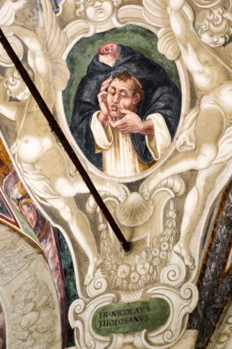 Another medallion shows St. Catherine of Siena, who spent time at the convent and whose tomb is the basilica next to the cloister. Friar Aucone notes wryly that while they have her body, they had to give her skull to the Dominican Friars in Siena.