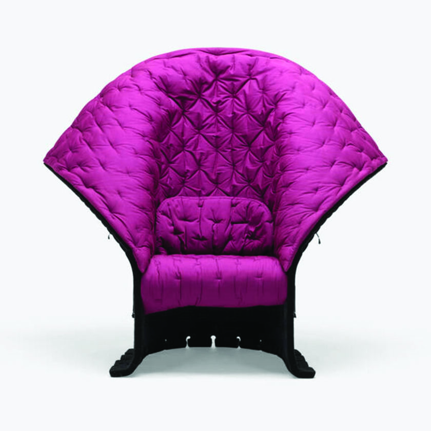 Like many of the great 20th-century designers, Pesce (1939-2024) trained as an architect and designed lamps, jewelry, other home furnishings, furniture, and buildings. He is known for his clever work with resin and extruded plastic, but his creative output has a softer side, too. His most famous furniture design might be the UP-5 chair, also called “La Mamma” for its curvy, feminine shape, with fabric upholstery over foam and rubber. The soft foam used in the UP chairs allowed them to be compressed flat for easy packaging, shipping, and storage. They sprang back into shape when the package was opened.