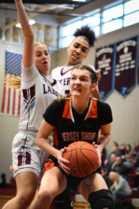 - RALPH WILSON/For The Express Jersey Shore’s Peyton Dincher looks for a shot around Loyalsock’s Julianna Ellis and Izzy Dadzie during a high school girl’s basketball game on Saturday at Loyalsock. Sock won 57-53.