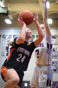 - RALPH WILSON/For The Express Loyalsock’s Julianna Ellis tries to shoot over the head of Jersey Shore’s Celia Shemory (24) during a high school girl’s basketball game on Saturday at Loyalsock. Sock won 57-53.